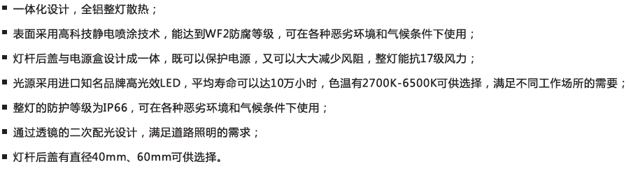 適用于主干道、公路、高架橋、市區街道、天橋、人行道等道路照明,以及學校、住宅區等需要戶外照明的場所。